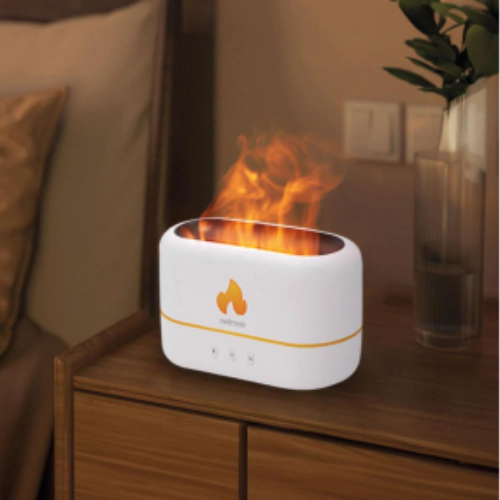 Difusor y humidificador ultrasónico de 250 ml con diseño innovador que combina aromaterapia y decoración. Su vapor iluminado con efecto flama LED en 7 colores crea un ambiente cálido y relajante, ideal para mejorar la calidad del aire y aliviar la sequedad. Funciona con conexión USB-C, es compatible con aceites, no requiere filtros y su tamaño compacto (17 x 8 x 12 cm) lo hace práctico y versátil.
